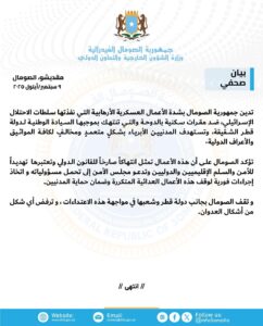 Soomaaliya waxay ka walaacsan tahay in falalkan ay si cad u xadgudbayaan sharciga caalamiga ah, isla markaana khatar ku yihiin amniga gobolka iyo kan caalamiga ah. Dowladda Soomaaliya waxay ugu baaqeysaa Golaha Ammaanka ee Qaramada Midoobay inuu qaado mas’uuliyaddiisa, isla markaana tallaabo degdeg ah ka qaado falalkan soo noqnoqda si loo xaqiijiyo ilaalinta shacabka iyo hantida caalamiga ah.