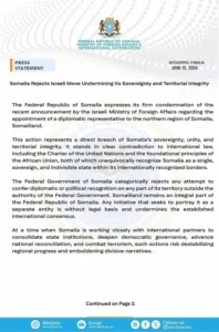 Dowladda Federaalka Soomaaliya ayaa si adag u cambaareysay war-saxaafadeed kasoo baxay Wasaaradda Arrimaha Dibadda ee Israa’iil oo ku saabsan magacaabista safiirkaoo Israa’iil u soo magacowday Somaliland.