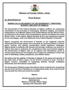 Warsaxaafadeed kasoo baxay Wasaaradda Arrimaha Dibadda ee Nayjeeriya ayaa lagu xaqiijiyey in Dowladda Federaalka Soomaaliya ay tahay hay’adda keliya ee sharciyeysan ee matasha shacabka Soomaaliyeed, isla markaana beesha caalamka ayay Nayjeeriya ugu baaqady inay ka fogaadaan tallaabo kasta oo ka dhan ah midnimada iyo madax-bannaanida Soomaaliya.