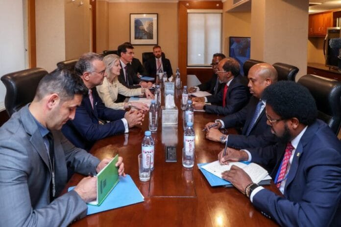 Madaxweynaha dowladda Federaalka Soomaaliya Xasan Sheekh Maxamuud, ayaa kulan gaar ah kula yeeshay magaalada New York Madaxa Arrimaha Siyaasadda ee Wasaaradda Arrimaha Dibadda Maraykanka, Marwo Allison Hooker, La-Taliyaha Arrimaha Afrika ee Madaxweyne Donald Trump, Mudane Massad Boulos, iyo Ku-Xigeenka Kaaliyaha Arrimaha Afrika, Mudane Vincent Spera.