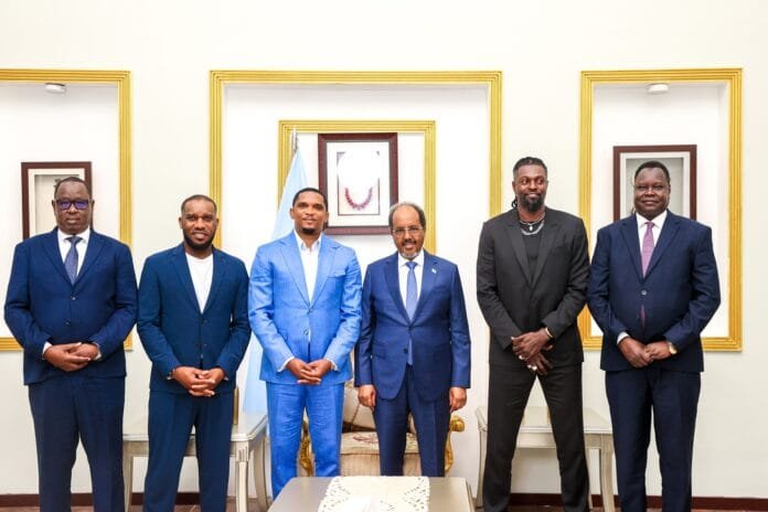 Madaxweynaha Jamhuuriyadda Federaalka Soomaaliya Mudane Xasan Sheekh Maxamuud ayaa Madaxtooyada ku qaabilay ciyaartoydii hore ee caanka ka ahaa dhanka kubadda cagta caalamka, Samuel Eto’o oo ah Gudoomiyaha Xiriirka Kubadda Cagta Cameroon, Emmanuel Adebayor iyo Jay-Jay Okocha oo booqasho taariikhi ah ku timid dalka.