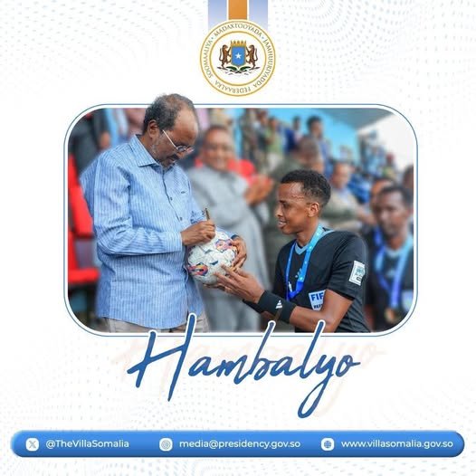 Madaxweynaha JFS, Mudane Dr. Xasan Sheekh Maxamuud, ayaa hambalyo u diray Garsoore Cumar Cabdulqaadir Cartan, kadib markii uu noqday garsoorihii Soomaaliyeed ee ugu horreeyay ee ka qayb gala tartanka caalamiga ah ee FIFA World.