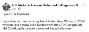 Qoraalka uu soo dhigey bartiisa Facebook Cabdicasiis Laftagareen ayaa sidan u qorneyd.