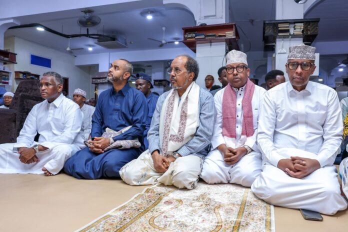 The President of the Federal Republic of Somalia, H.E Hassan Sheikh Mohamud, on Friday joined hundreds of worshippers in observing Jumu’ah prayers at Abu Huraira Mosque, located in Mogadishu’s Bakara Market.