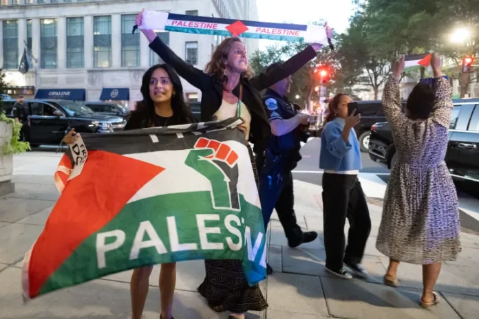 A video shared online by the activist group Codepink shows people chanting, “Free DC! Free Palestine! Trump is the Hitler of our time!”.