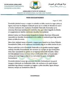 Warsaxaafadeedka Jubbaland ayaa lagu sheegay in Dowladda Federaalka ay ka weecatay ajandeyaashii muhiimka ahaa ee dalka, gaar ahaan dagaalka lagula jiro argagixisada iyo ilaalinta midnimada shacabka Soomaaliyeed. Jubbaland waxay ku baaqday wadatashi qaran, iyadoo sheegtay in hoggaanka hadda jira uu ku guuldarreystay mideynta shacabka, kana mashquulay dano siyaasadeed oo gaaban.