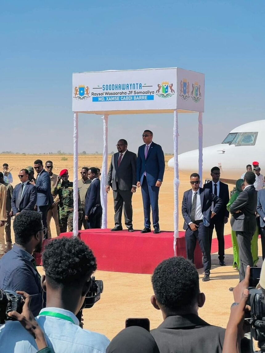 Wafdogaasi uu hoggaaminaayey R/wasaaraha waxaa Garoonka Diyaaradaha ku soo dhoweeyay masuuliyiin kala duwan oo ka socday dowladda federaalka ,maamulka Woqooti Bari iyo shacabka ku dhaqan magaalada Laascaanood.
