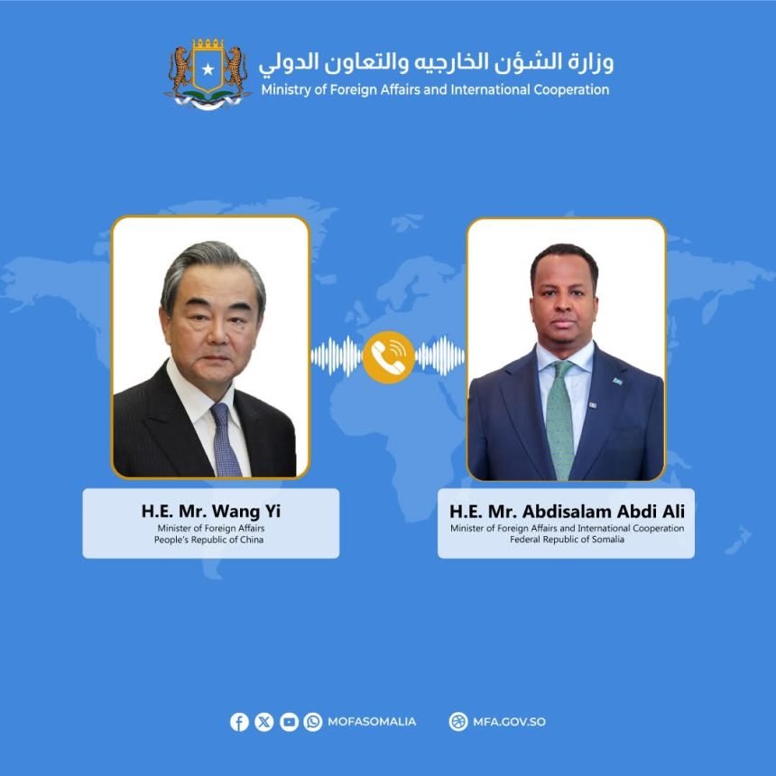 The Minister of Foreign Affairs and International Cooperation of the Federal Republic of Somalia, H.E. Abdisalam Abdi Ali, on Monday held a phone call with H.E. Wang Yi, Member of the Political Bureau of the CPC Central Committee and Minister of Foreign Affairs of the People’s Republic of China.