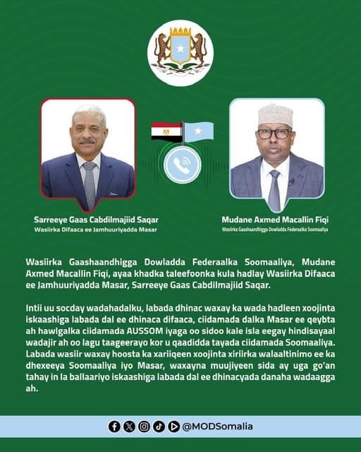 Wasiirka Gaashaandhigga Dowladda Federaalka Soomaaliya, Mudane Axmed Macallin Fiqi, ayaa khadka taleefoonka kula hadlay Wasiirka Difaaca ee Jamhuuriyadda Masar, Sarreeye Gaas Cabdilmajiid Saqar.