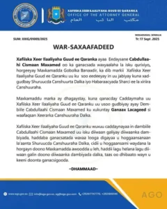 Xafiiska Xeer Ilaaliyaha Guud ee Qaranka ayaa ganacsatada Soomaaliyeed uga digay u hoggaansanaan la’aanta sharciga canshuuraha dalka, xilli Maxkamadda Gobolka Banaadir ay xukuntay ganacsato ku xadgudbay sharcigaas.