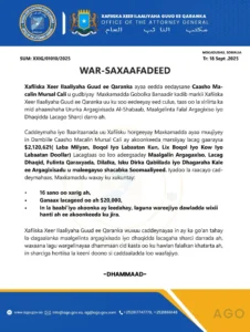 Maxkamadda gobolka Banaadir, ayaana ku xukuntay Caasho Macallin Mursal 16 sano oo xabsi ah iyo ganaax lacageed oo gaaraya 20 kun oo dollar, sidoo kale dowladda Soomaaliya ayaa la wareegtay waxii lacag ah oo akoonka gabadhaasi ku jiray.